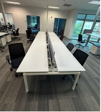 63′ x 27″ benching stations with one mobile box/file pedestal, divider screens, and power down the spine.
