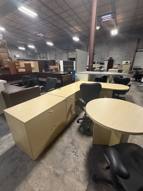 Bullet top Maple L-Desk. Matching lateral file and round table also available.