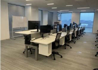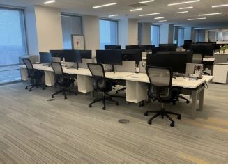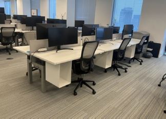 Haworth 60″x30′ benching stations with height adjustable surface, surface mounted power module, and privacy screen. Powered down the spine. Undermount storage not included, however mobile pedestals can be provided.