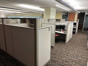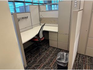 Herman Miller 6′ x 6′ workstations with 67″ H panels on the spine and 57″ H panels on the wings. Workstations include one box/box/file pedestal, one wardrobe cabinet, and one whiteboard. Powered down the spine.