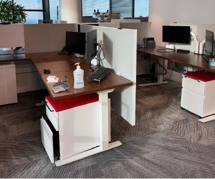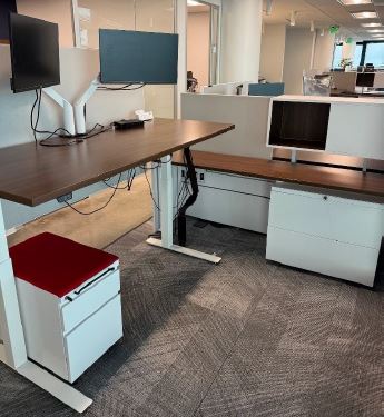 Super clean Knoll workstations with height adjustable surface, mobile box/file pedestal, lateral file cabinet, and dual monitor arm. Powered down the spine.