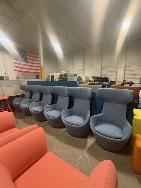 OFS wingback lounge chairs in blue.