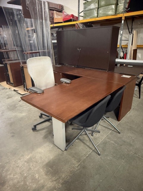 Walnut veneer L-desks with 2-drawer lateral file.